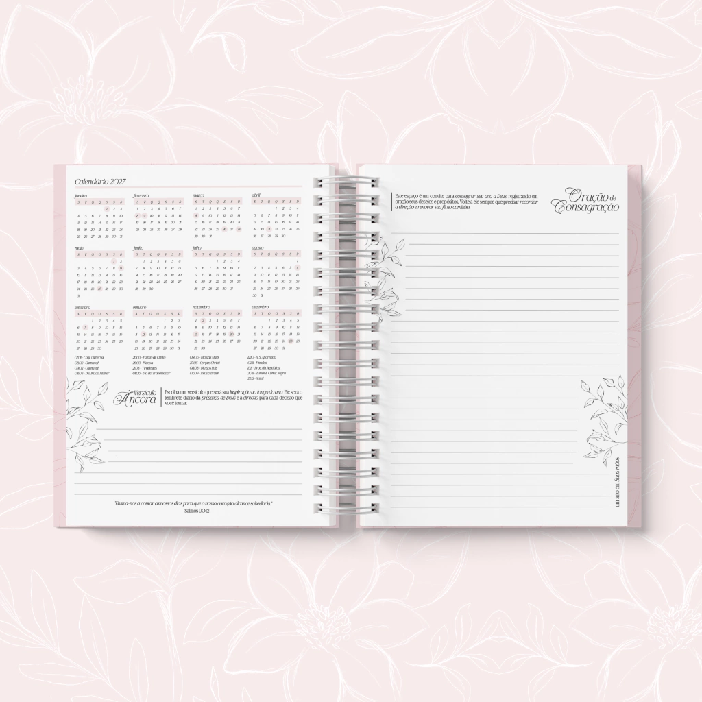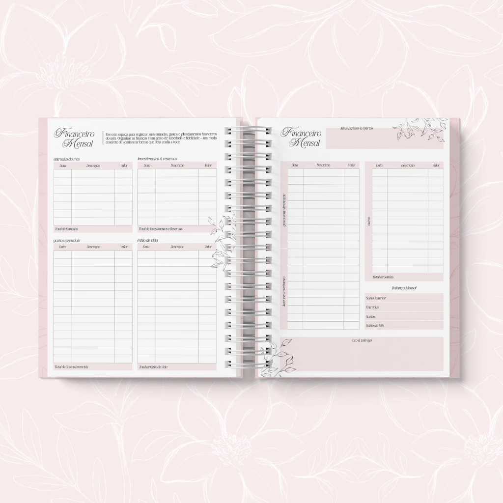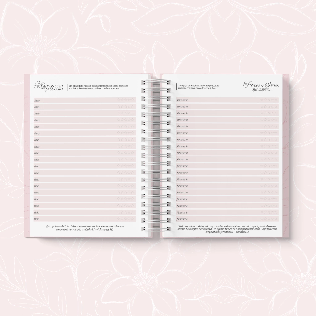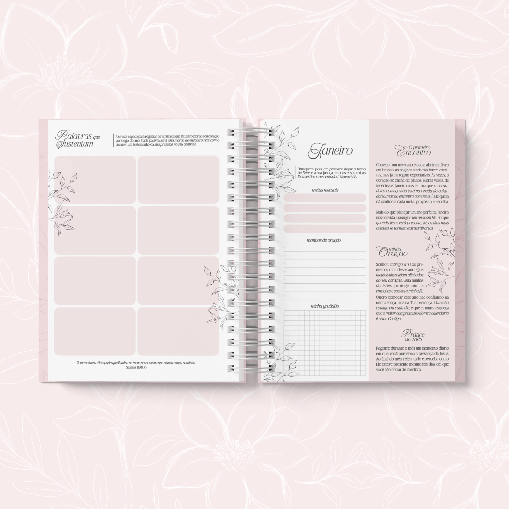 O Planner Cristão foi pensado para te conduzir em uma jornada de fé, gratidão e organização, unindo beleza, inspiração e intencionalidade em cada página.